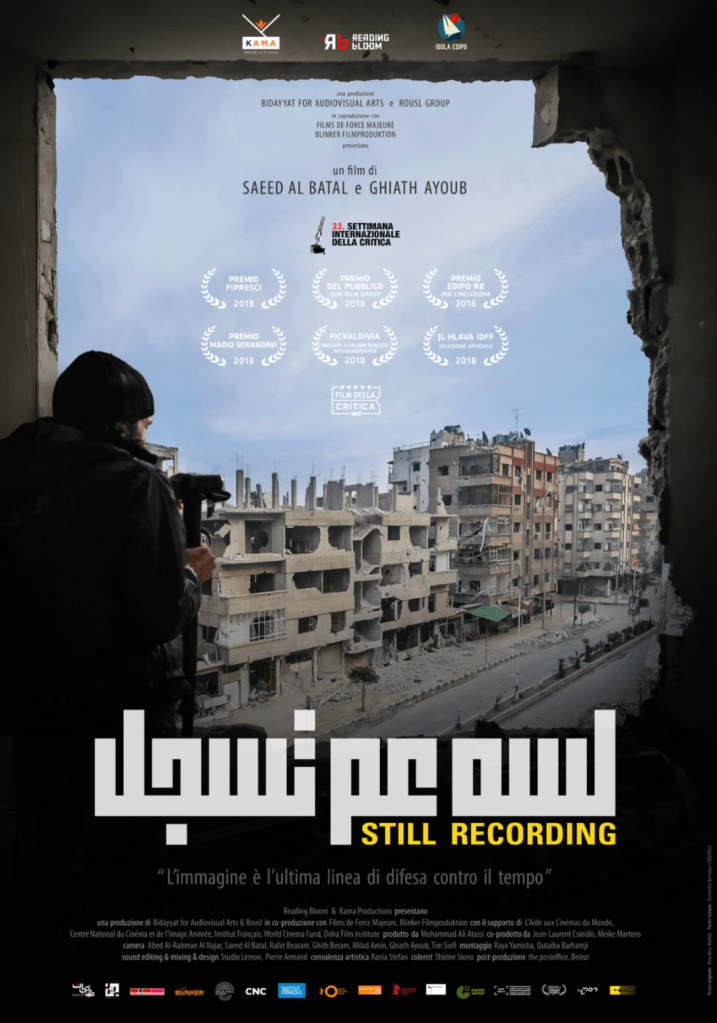 Still Recording is a feature documentary that follows art students Saeed and Milad, who decide to leave Damascus and go to Douma, a suburb under rebel control. Over more than four years, the film depicts the two friends and their acquaintances as they go about their daily lives, capturing the transformation of the city of Douma and its people as they go through liberation, war, siege, and hunger. More than 500 hours of footage was shot, and the men face grave questions about life and death, revolution and armed struggle, dreams and doubts, fear and love, and the use of art in a world facing destruction